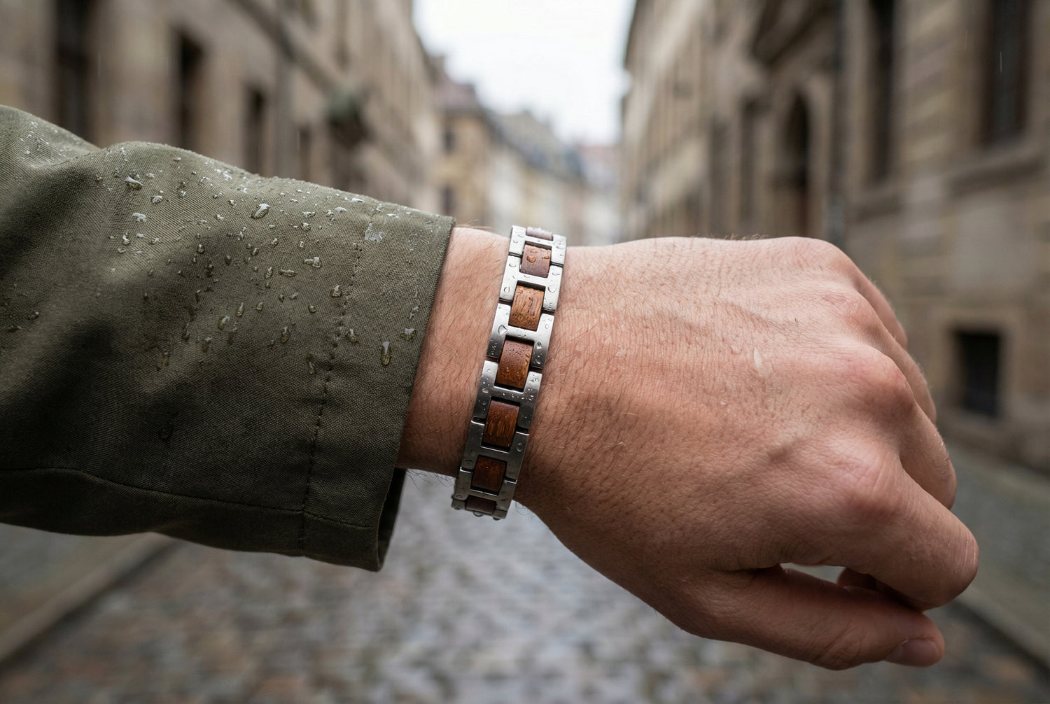Stal nierdzewna i odpowiednio zabezpieczone naturalne drewno pozwalają nie zdejmować jej podczas mycia rąk czy brania prysznica. Po prostu noś ją każdego dnia.
